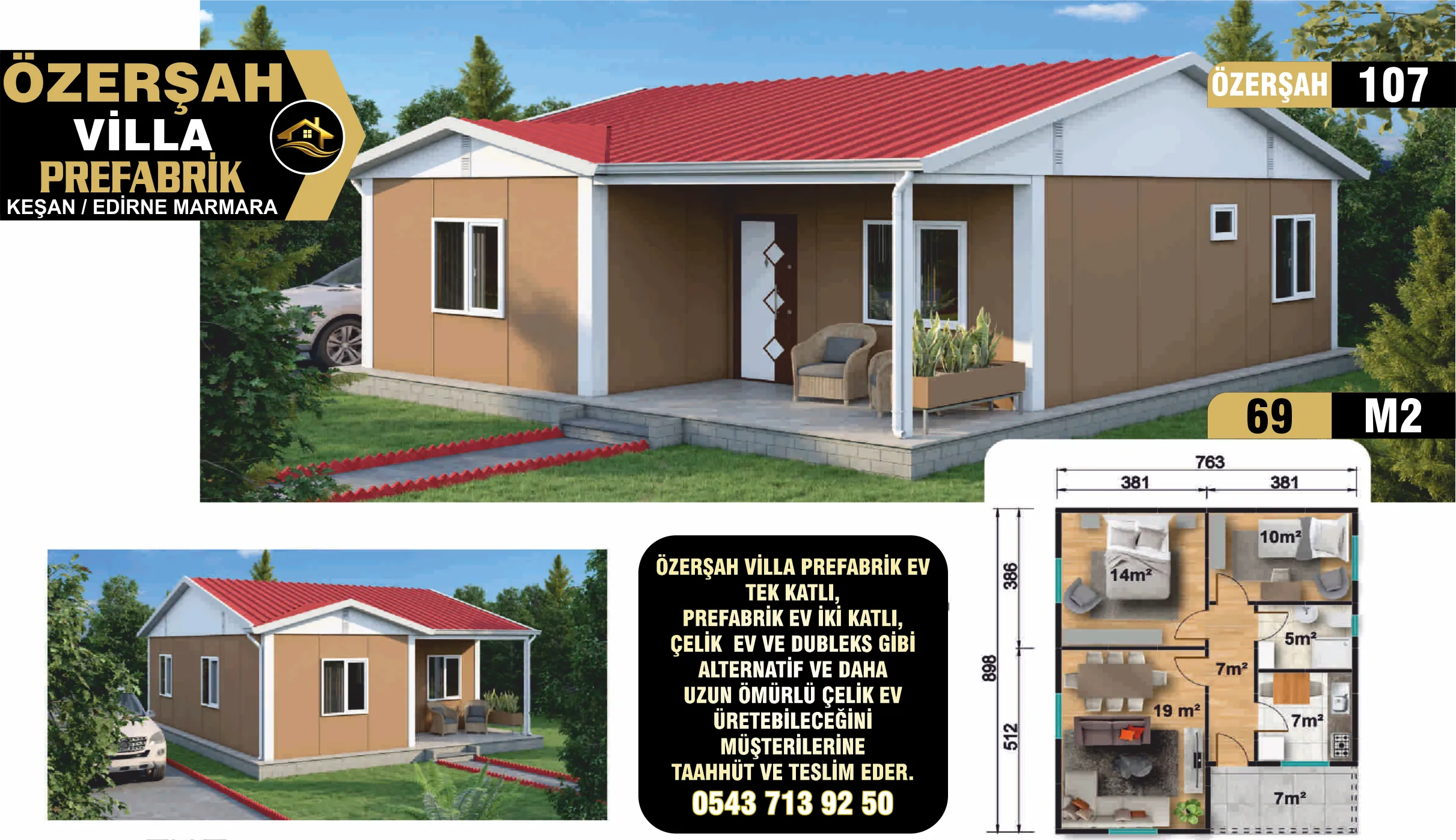 Prefabrik Ev Veya Çelik Ev, Tek Katlı, İki Katlı Villa Tipi, 3 Katlı Triplex Olarak Tasarlanabilen önceden fabrika ortamında üretilen ve daha sonra inşaat alanına taşınarak montaj ve kurulumunun yapıldığı konutlardır. İşte Prefabrik ve Çelik evlerin bazı özellikleri: Hızlı İnşa Süreci: Prefabrik ve Çelik, fabrika ortamında parça parça üretildiği için inşaat süreci hızlıdır. Bu, kısa sürede konut sahibine teslim edilmesini sağlar. Ekonomiklik: Prefabrik ve Çelik, seri üretim avantajından faydalanarak daha ekonomik bir seçenek sunar. Daha düşük maliyetlerle üretildikleri için daha uygun fiyatlarla satın alınabilirler. Taşınabilirlik: Prefabrik ve Çelik, demonte edilebilir yapıları sayesinde taşınabilirlik avantajı sağlar. İhtiyaç halinde başka bir yere taşınabilir veya yeniden monte edilebilirler. Çevre Dostu: Prefabrik ve Çelik evler, fabrika ortamında kontrollü bir şekilde üretildiği için atık miktarı düşüktür. Ayrıca, enerji verimliliği sağlamak amacıyla çeşitli izolasyon ve yenilenebilir enerji sistemleri entegre edilebilir. Tasarım Esnekliği: Prefabrik ve Çelik evler, farklı tasarım seçenekleri sunar. İhtiyaçlara ve zevklere uygun olarak özelleştirilebilirler. Farklı boyutlarda, kat planlarında ve malzemelerde çeşitlilik sağlanabilir. Dayanıklılık: Prefabrik ve Çelik evler, genellikle dayanıklı malzemelerden üretilir. Bu malzemeler, yapıyı güçlendirir ve uzun ömürlü olmasını sağlar. Teknolojik Donanım: Prefabrik ve Çelik evlerde, modern konforu sağlamak amacıyla teknolojik donanımlar kullanılabilir. Elektrik, ısıtma-soğutma ve iletişim sistemleri gibi teknolojik bileşenler entegre edilebilir. Enerji Verimliliği: Prefabrik evler, yüksek izolasyon özellikleri sayesinde enerji tasarrufu sağlar. İyi yalıtılmış duvarlar, çatılar ve pencereler, enerji tüketimini azaltır ve sürdürülebilir bir yaşam alanı sunar. Projede Özerşah Performansını En Güzel Şekilde Deneyimleyebilirsiniz.
